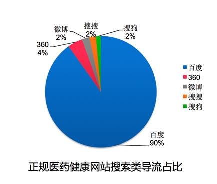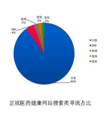 如果只计算来自搜索引擎的流量,百度对top10正规医疗网站的流量贡献占比则高达90%,360搜索占比约4%,新浪微博、搜搜、搜狗分别占比2%。